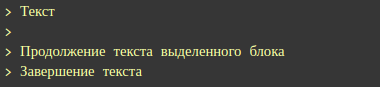 readme Допустимы вложенные цитаты (цитата в цитате). Тогда цитата второго уровня выделяется двумя знаками ">>", а цитата третьего уровня вложенности - тремя.