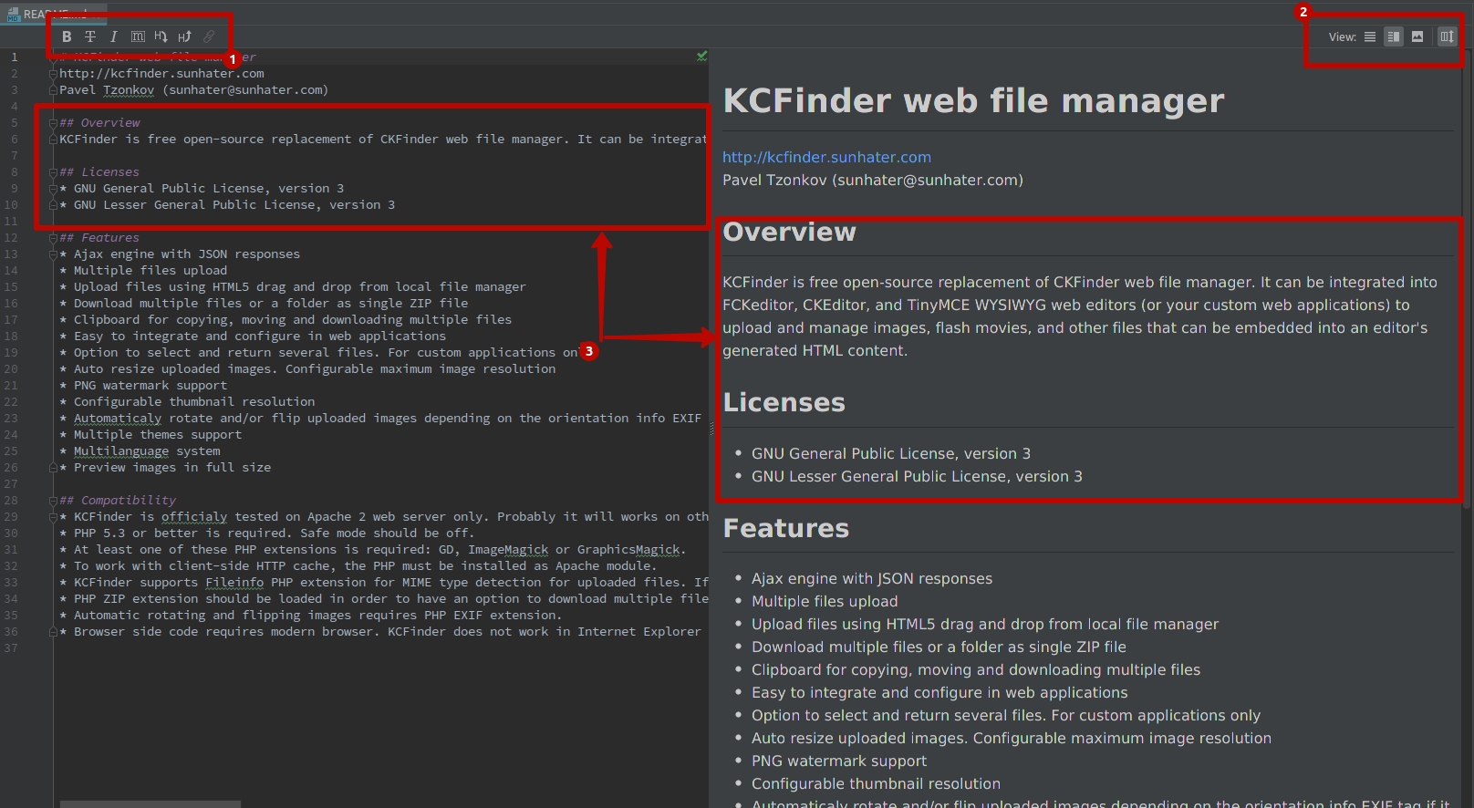 2 окна (как на скриншоте): слева - сырой markdown, справа - как это будет выглядеть на HTML странице после конвертации.