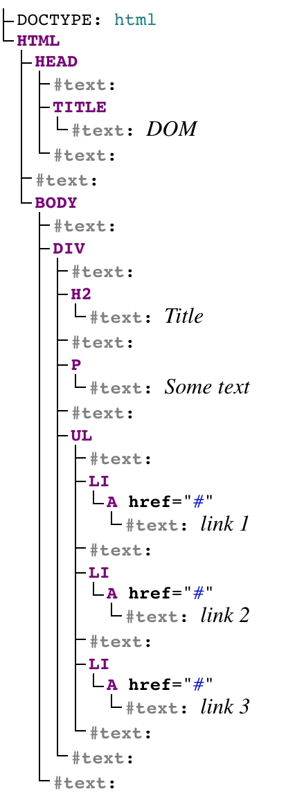 Текстовые узлы (text node) — образуются текстом внутри элементов. Текстовый узел содержит только строку текста и не может иметь потомков, то есть он всегда на самом нижнем уровне иерархии. Пробелы и переносы строк - это тоже текстовые узлы.