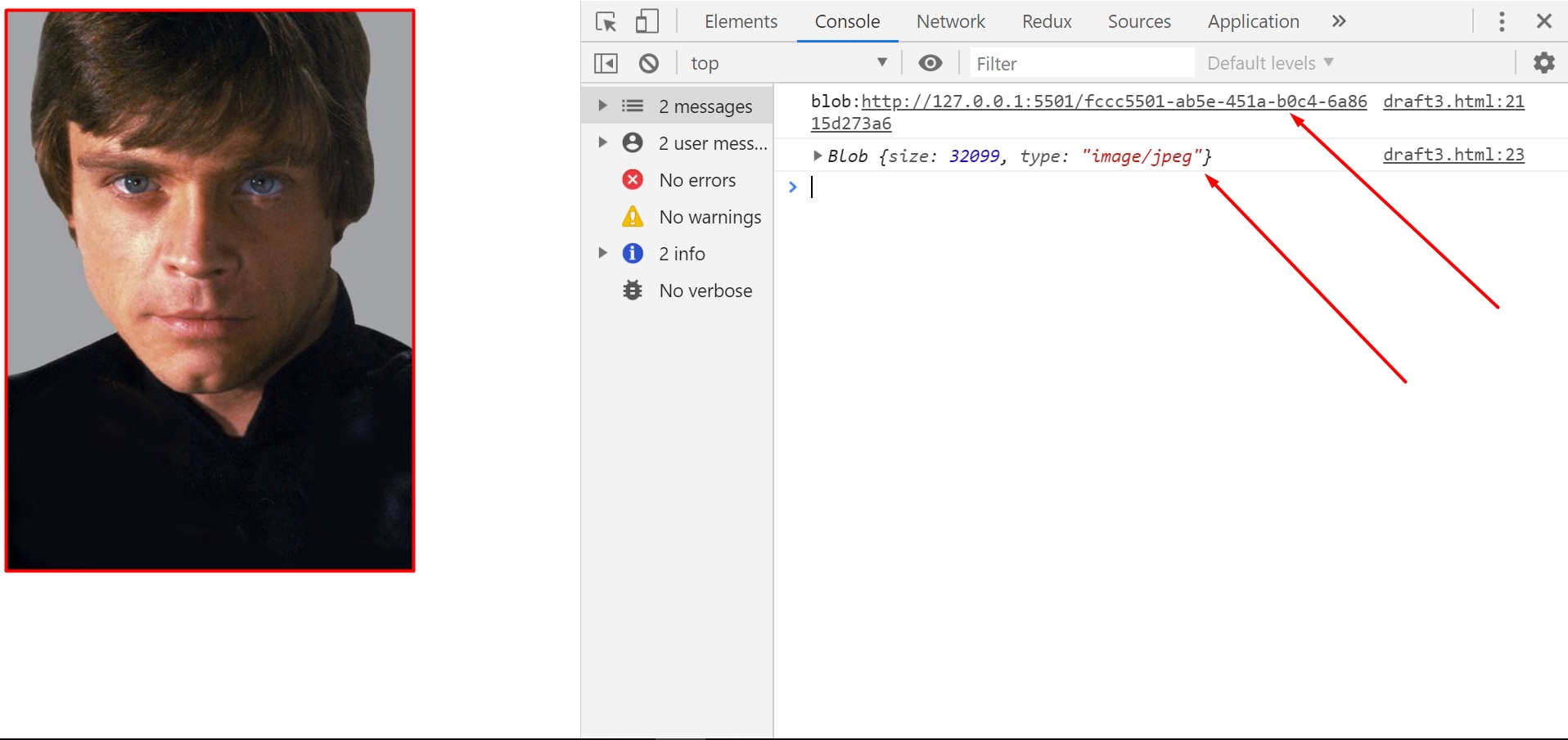 В консоль инспектора мы вывели ссылку на картинку и сам обьект Blob, внутри которого есть два аргумента: объем и формат картинки.