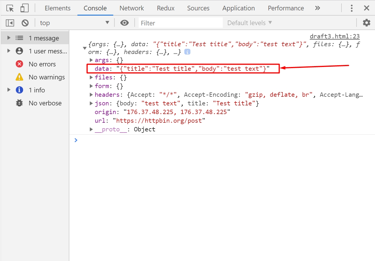 В результате в консоли мы можем увидеть, что нам пришли данные от сервера в формате