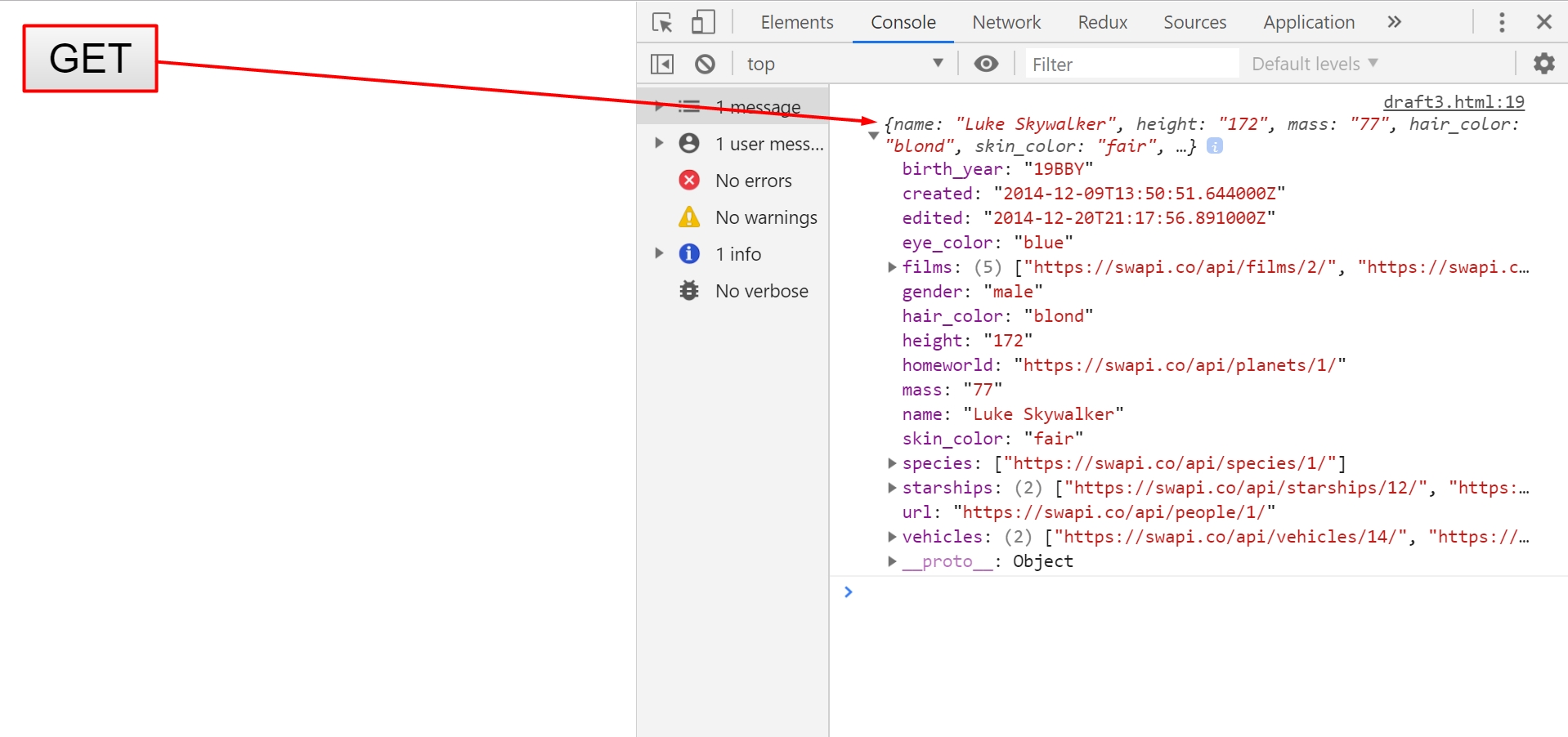 Для начала рассмотрим пример получения данных при обращении на внешний сервер swapi.co.