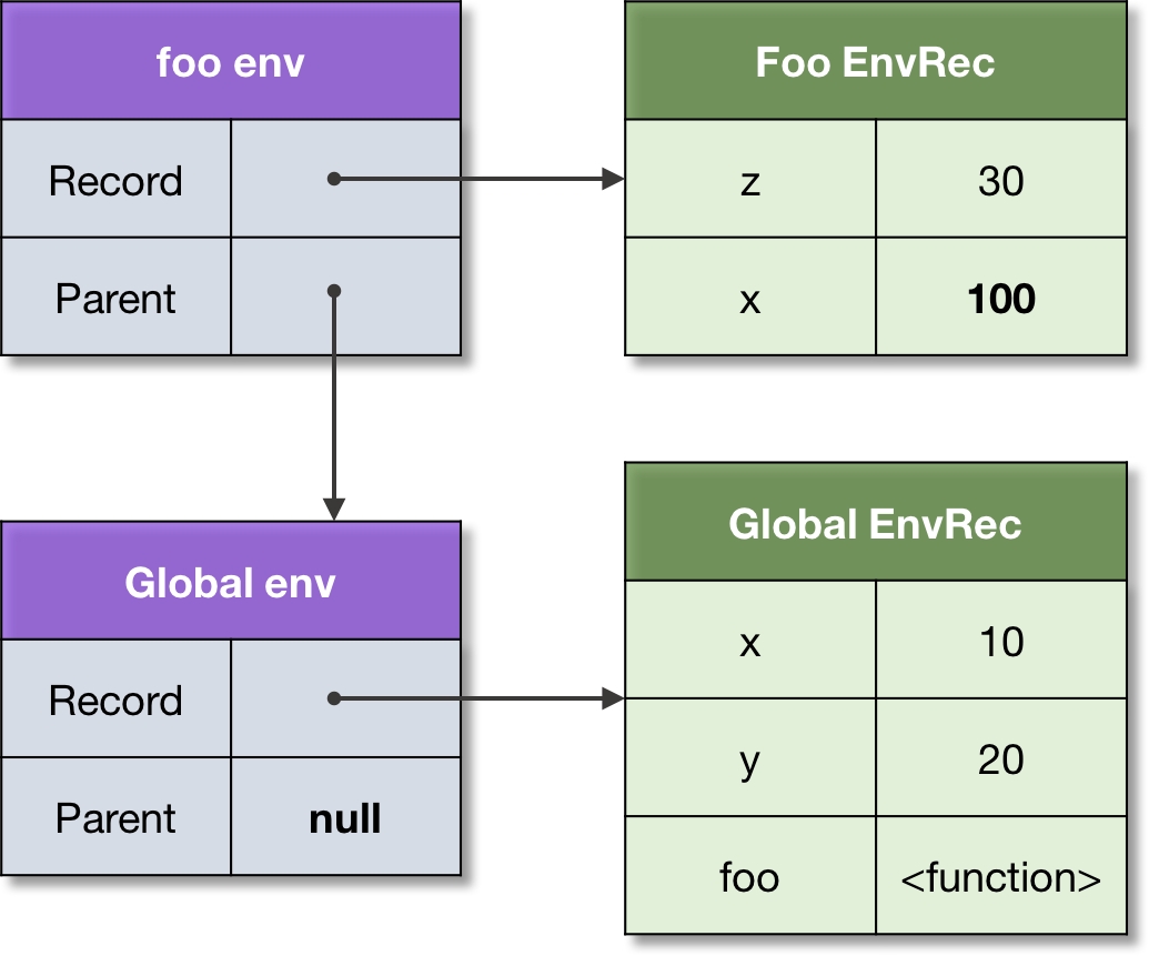 Лексическое окружение (lexical environment) — внутренняя, закрытая от прямого доступа структура движка для хранения в памяти таблицы (Environment Record) идентификаторов переменных и их значений, а так же значение this и механизм для извлечения этих значений при обращении по имени, а так же ссылки на родительское лексическое окружение (Parent).