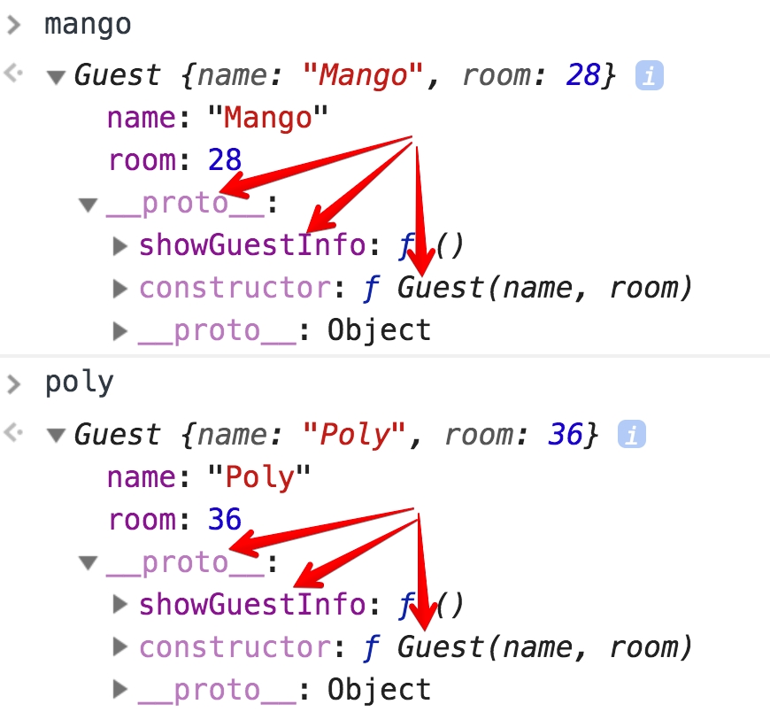 Причем если мы создадим миллион экземпляров гостя, набор методов будет не у каждого свой, а всего один, общий, хранящийся в свойстве Guest.prototype и доступный всем потомкам по ссылке, которая записывается в поле __proto__ объекта при создании из-за прототипного наследования и цепочки прототипов.